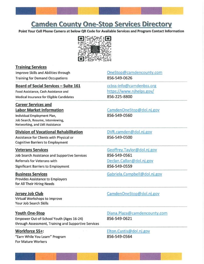 The local Virtual Services Directory (See below) includes direct contacts primarily for Camden County residents; however, for residents outside of the county, Career Counselors will help them connect with the appropriate county contact.